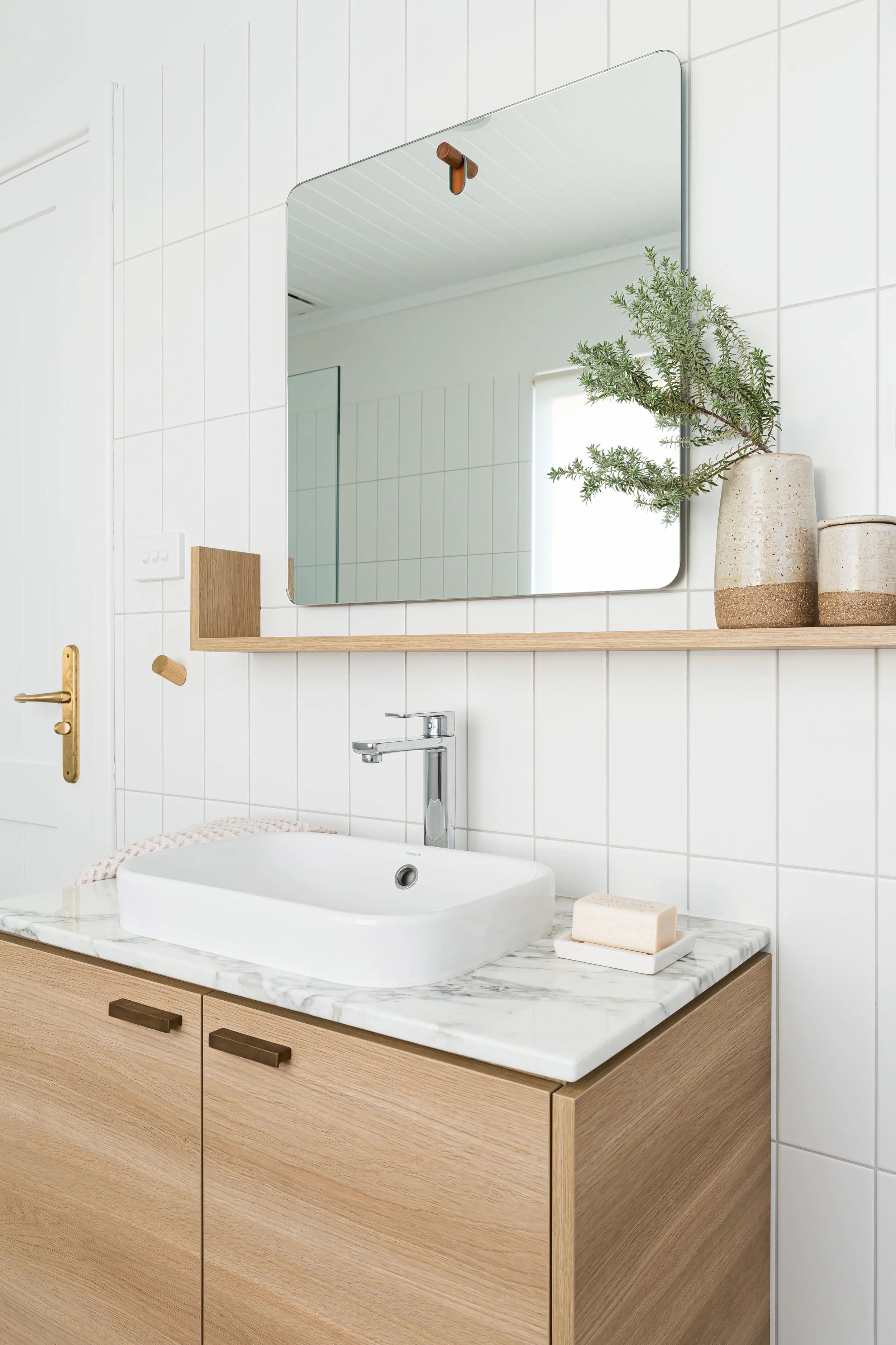 Walnut floating vanity and finger tiles in the Kirwin bathroom. Interiors by Jo Carmichael Interiors